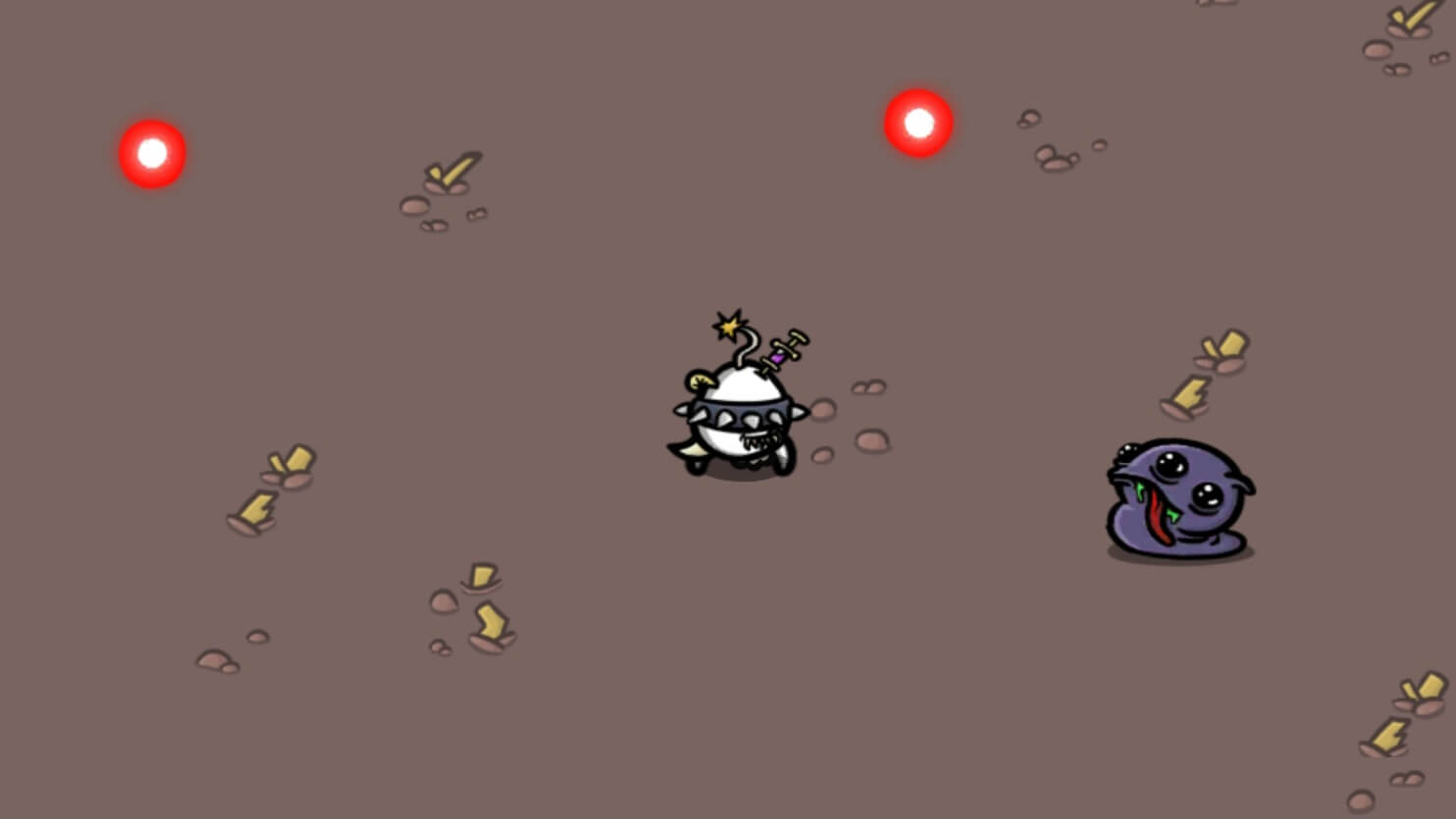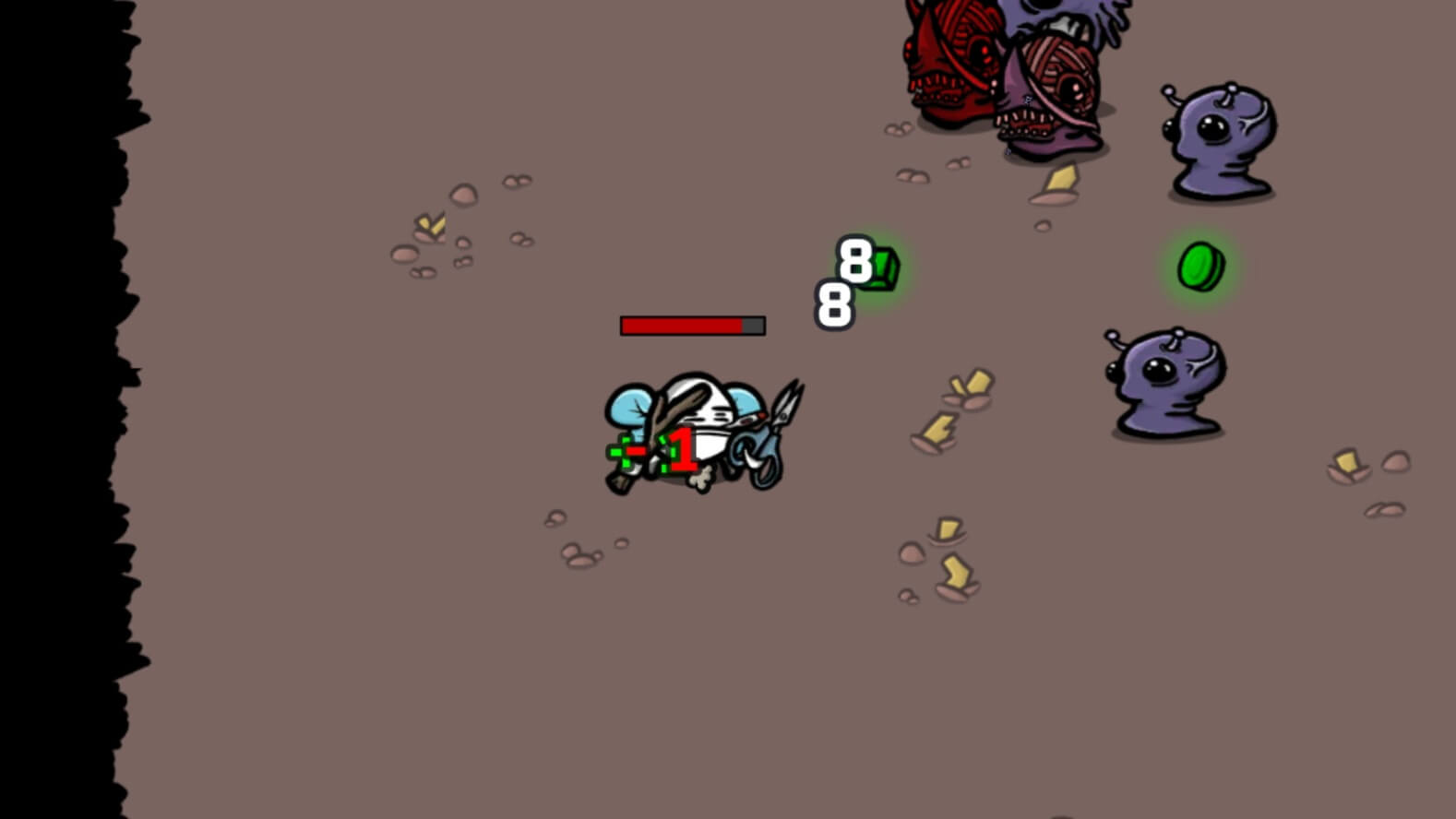 土豆的游戏画面非常卡通,乍看有些粗制滥造,其实细节一点也不少。不仅每种武器和怪物都有不同的样貌,在商店中购买的道具也会影响到土豆们的外观,比如说下面两张图里土豆背后的蓝色翅膀和头上的针筒之类的东西都是装备道具后的效果,真的很欢乐。