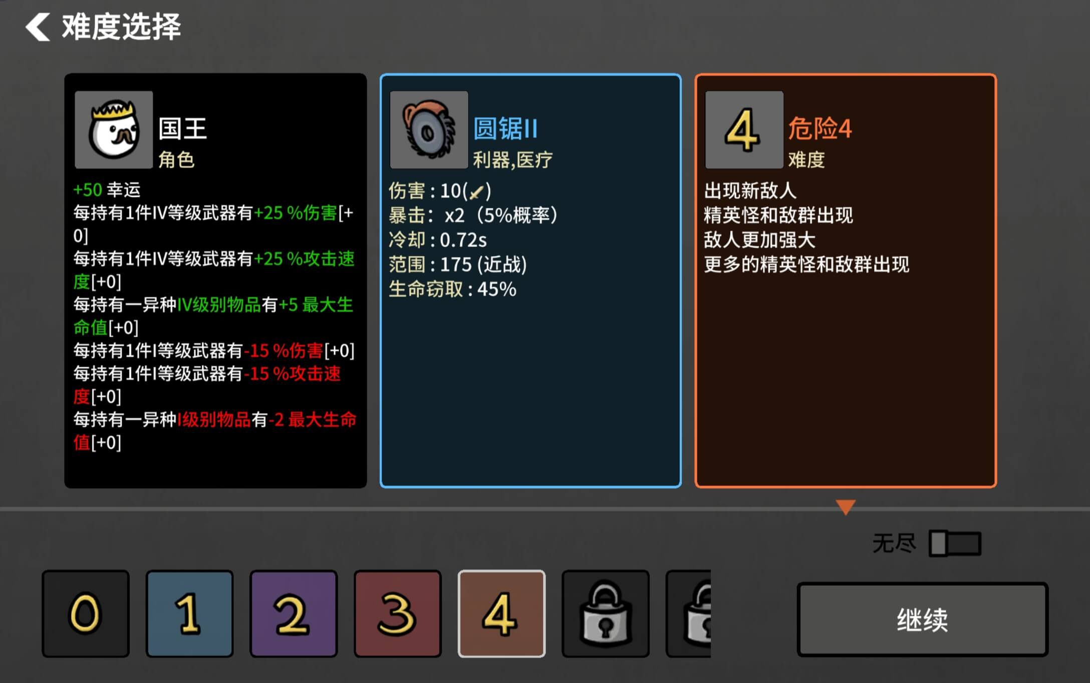 土豆中共有十档难度,从最低难度开始成功通关才能解锁下一档。每局游戏共有 20 关,游戏开始时我们需要选择角色、初始武器和难度,除了 Boss 战每关的时长都不会超过一分钟,节奏非常快。哪怕 Boss 战也不是非要把 Boss 打死不可,撑住别死就能过关。能杀掉 Boss 当然更好,能获得额外奖励。相较于吸血鬼,土豆的设定极大的降低了上手门槛,也更加适合在手机或掌机上游玩。