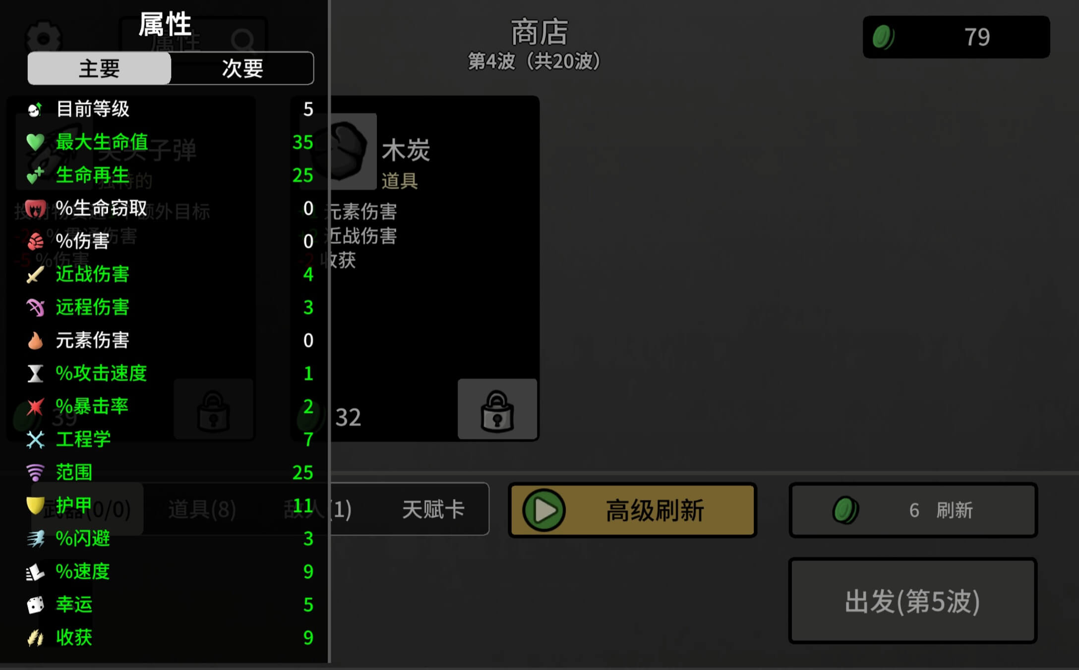 角色自带的天赋属性对游戏进程影响最大,会直接影响到我对武器和道具的选择。比如某些角色不能携带远程武器,那我在升级时就可以规避相关的属性提升。每种武器和道具的属性也是固定的,但它们会随机出现在商店中,给配装带来了很大的肉鸽与随机成分。在这些随机性的基础上,我能做的就是根据角色的天赋理清不同属性的优先级,尽量选择更加合适的装备。