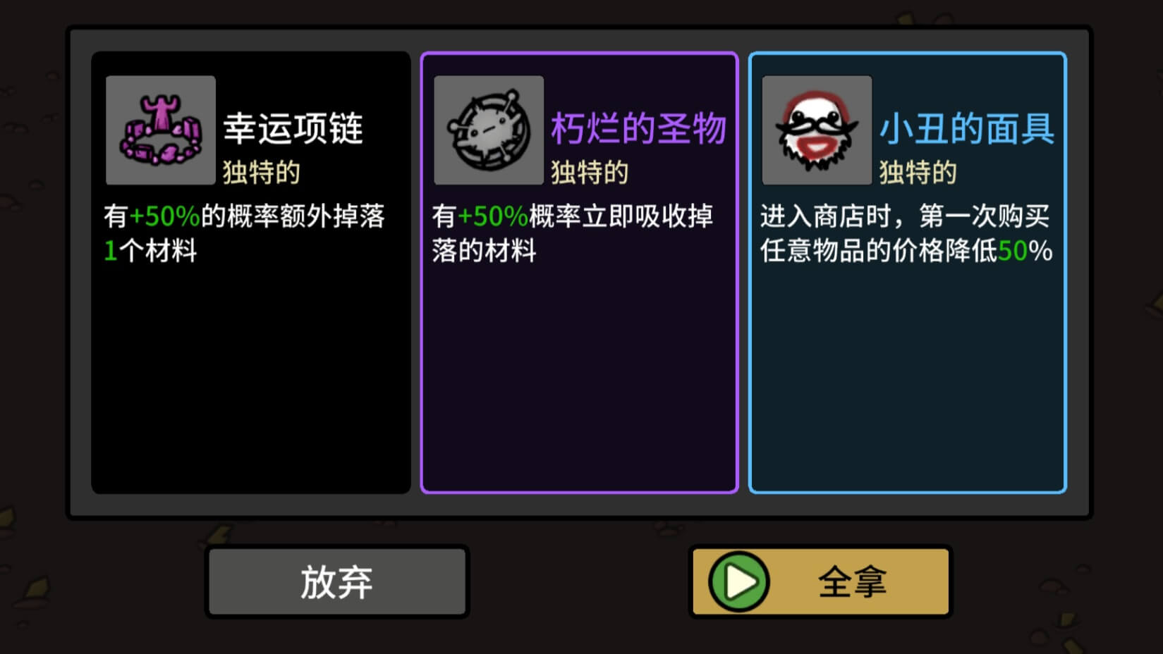目前安卓版土豆是免费的,在游戏中加入了观看广告的模块。我每次看到有些人喷土豆里的广告,都会怀疑这些人是不是真的玩过 PC 或者主机版土豆。因为安卓版土豆中并没有开屏广告或其他强制看广告的设定,如果我想要和 PC 端一样的游戏体验就不需要看任何广告。事实上看广告的效果是降低游戏难度,比如下图是每局战斗开始前的特殊道具宣传页,选放弃就是正常进入游戏,选全拿则是看广告获得这些道具,变相降低了整场游戏的难度。其他提供看广告功能的地方也是如此,倒是给了手残玩家一条活路。