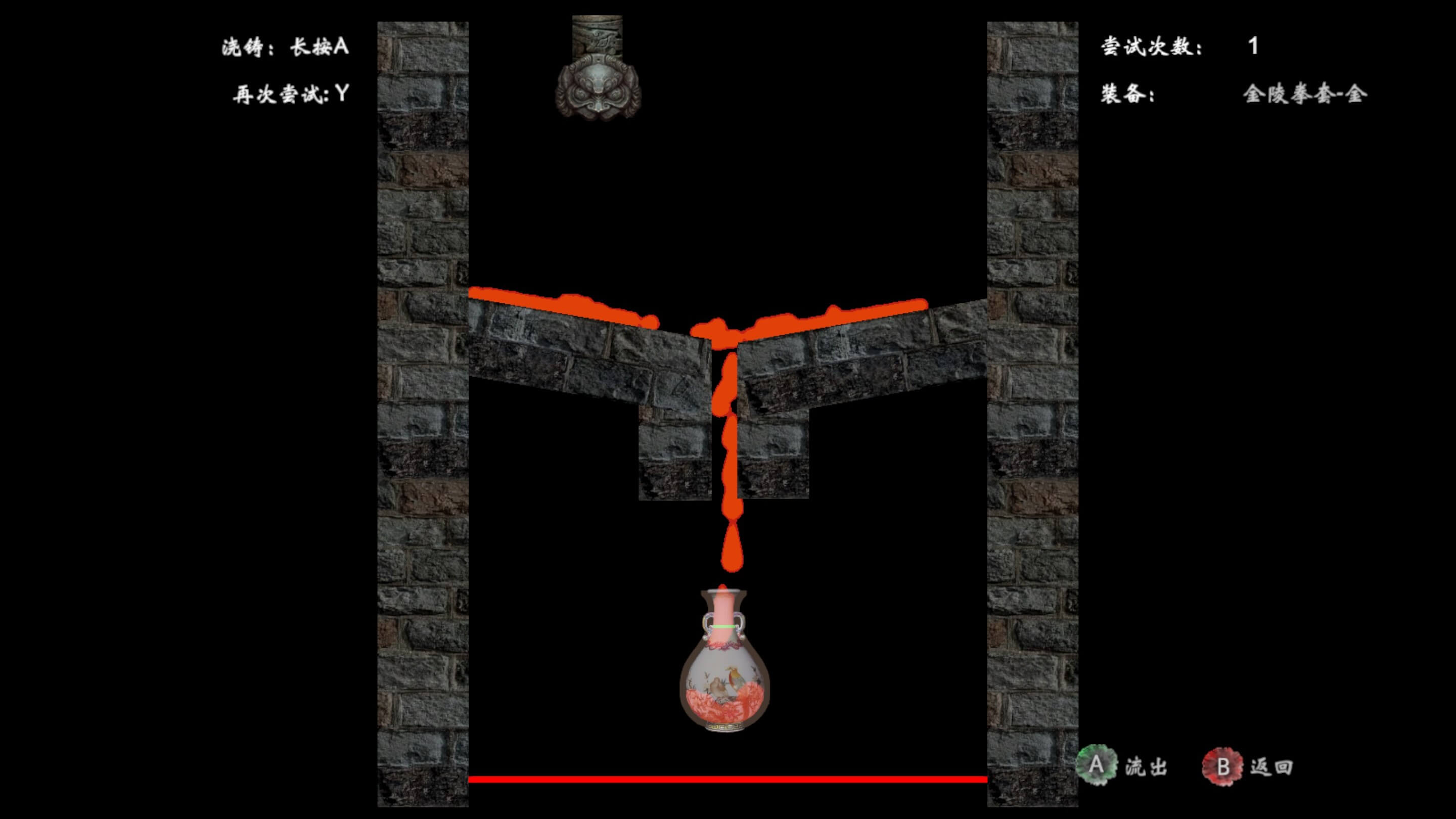除了动作部分,嗜血中还设计了若干个小游戏来缓解高强度战斗的紧张感,可这些小游戏的制作水平实在是有点捣糨糊。我最喜欢的一个小游戏是可以提升装备稀有度的熔炼游戏,玩家要先估测下方瓷瓶的大小,然后凭感觉释放数量恰到好处的红色汁液,刚好灌满瓶子就能升级装备。熔炼游戏的界面长这样: