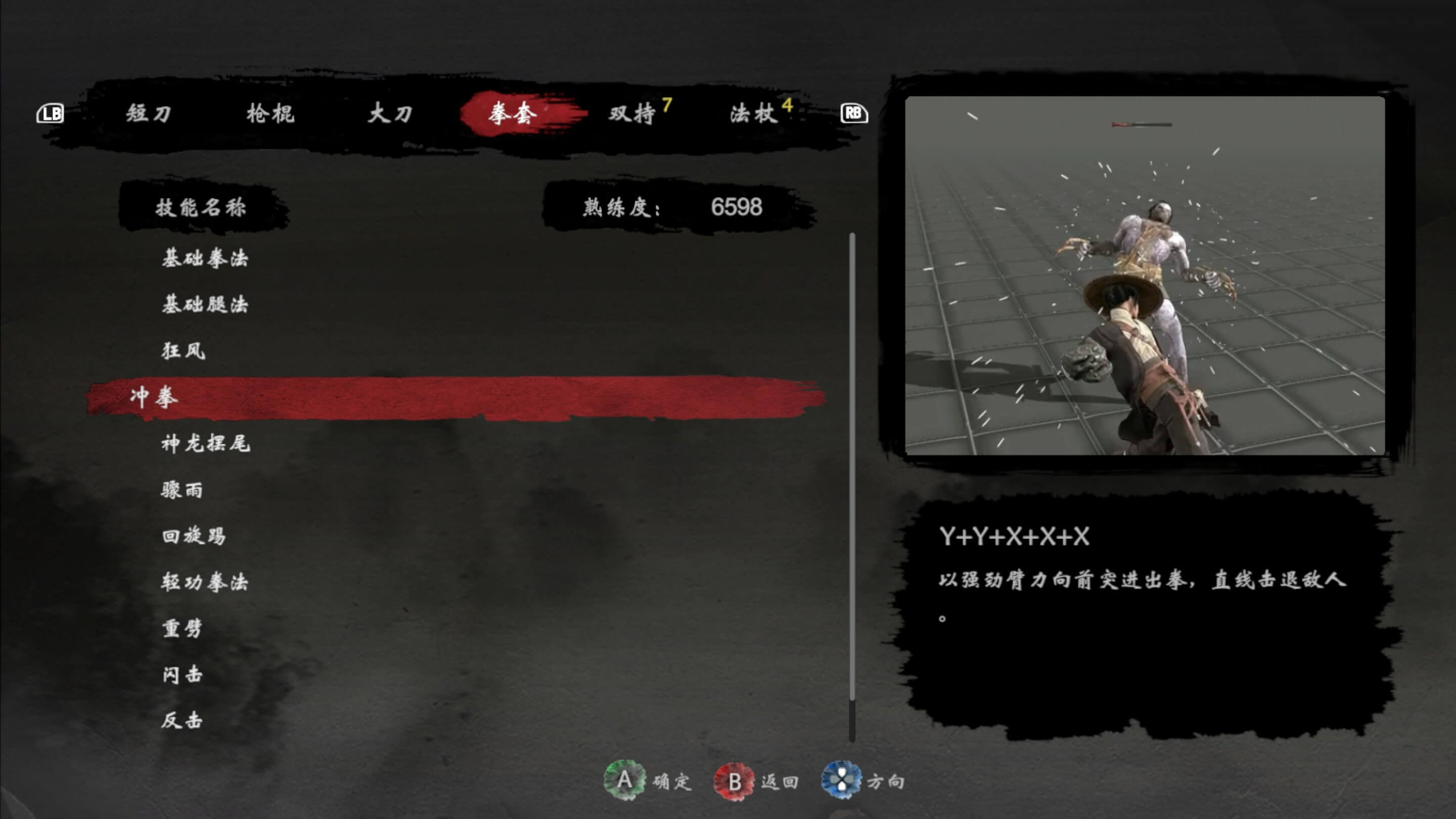 游戏中有短刀、枪棍、大刀、拳套、双持、法杖等共计六种兵器,其中法杖是主角师妹的专属兵器,其余五种为主角的可选兵器。这六种兵器的攻击频率、攻击范围和技能机制都是完全不同的,并且有各自的连招组合,需要分别使用它们进行战斗提升熟练度才能逐渐解锁。比如大刀类似怪猎中的大剑,攻击频率非常低,但重击可以蓄力,攻击范围巨大。双持武器乍看类似怪猎中的双刀,实际上可以将两把刀的刀柄连接变成长刀⸺类似中国传统的乾坤日月刀。长刀和双刀形态下的技能并不相同,长短切换才是双持武器的连招核心。